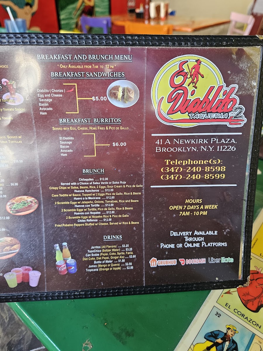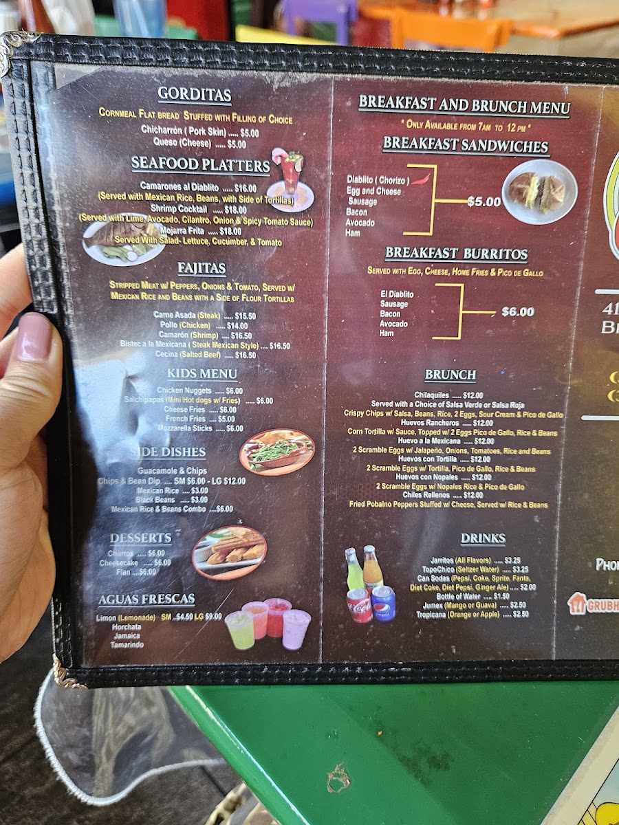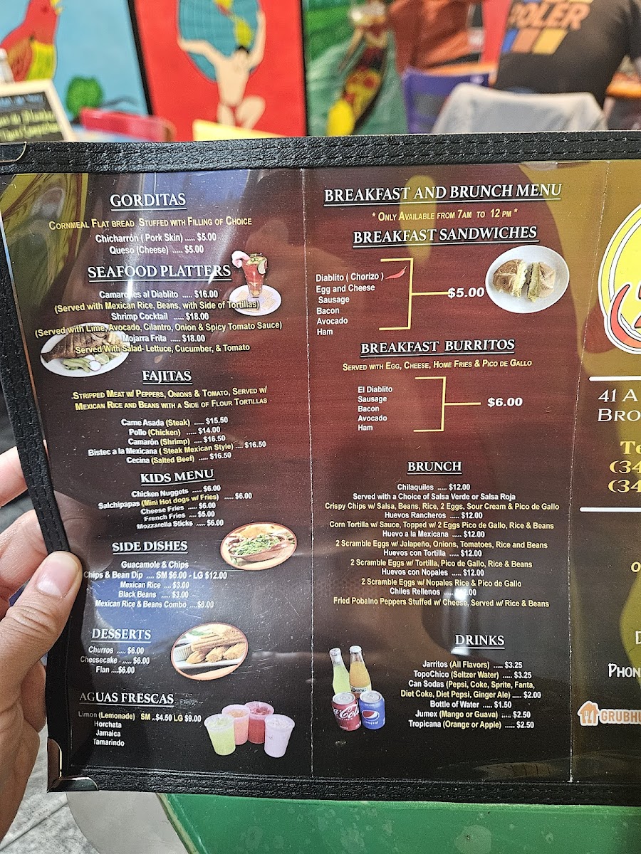 El Diablito Taqueria 2 offers a vibrant and diverse menu, perfect for any craving. For breakfast, they serve options like the Breakfast Sandwich and Breakfast Burritos, along with a flavorful El Diablito Omelette. Brunch favorites include Chilaquiles Brunch and Huevos Rancheros Brunch, with variations like Huevos Con Nopales. The tamales selection includes classic choices like Tamales De Mole and Tamales Verde, alongside Tamales De Rajas and Tamales Rojo. Tacos are a highlight, with options such as the Pollo Taco, El Diablito Taco, and Carnitas Taco, all bursting with authentic flavors. Their burritos, including the Pollo Burrito and Carnitas Burrito, are hearty and satisfying. For something more filling, the El Diablito Torta or Al Pastor Torta is a must-try, as are the Cemitas, featuring spicy chorizo or slow-roasted pork. The menu also boasts a variety of quesadillas, including the El Diablito Quesadilla and Al Pastor Quesadilla. For those craving comfort food, the Pollo Enchilada and Carne Asada Enchilada are excellent choices. You can also enjoy delicious snacks like Tostadas, Gorditas, and Sopes with various fillings. For something different, try the Huaraches or Nachos with your choice of protein, or go for crispy Flautas. The fajitas are available in chicken, steak, or shrimp, and the platters like Bistec A La Mexicana offer a generous serving of traditional Mexican fare. Seafood lovers will enjoy options like the Camarones Al Diablito or the crispy Mojarras Fritas. The kids' menu includes simple but tasty options like Kids French Fries and Kids Nuggets. To satisfy your sweet tooth, don't miss the Churros or Cheesecake, while refreshing drinks like Jarritos and Horchata pair perfectly with your meal.